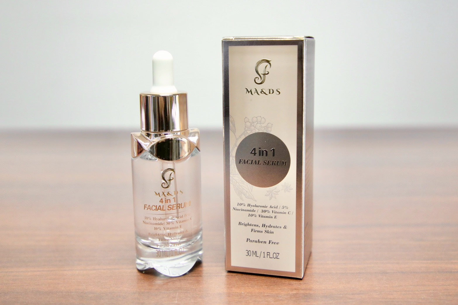 MA&DS เซรั่มบำรุงผิวหน้า 4-in-1 คือเซรั่มประสิทธิภาพสูงที่ได้รับการพัฒนาขึ้นเพื่อช่วยปรับสีผิว เนื้อผิว และความกระจ่างใสของผิวโดยรวมให้แลดูดีขึ้นอย่างเห็นได้ชัด ผสานคุณค่าจากวิตามินซี ไนอะซินาไมด์ ไฮยาลูโรนิก แอซิด และสารสกัดว่านหางจระเข้ ช่วยเติมเต็มความชุ่มชื้นอย่างล้ำลึก ลดความหมองคล้ำ ลดเลือนจุดด่างดำ และช่วยให้รูขุมขนแลดูกระชับ เผยผิวเรียบเนียน เปล่งปลั่ง และสดใสอย่างเป็นธรรมชาติ